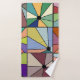 Este conjunto de toalhas tem um pano de lavagem leve, uma toalha de mão teal, e uma toalha de banho com um desenho abstrato que é feito de nove quadrados com um círculo e "raios" saindo do círculo em muitas cores diferentes.