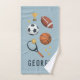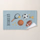 Este conjunto de toalhas de banho para crianças azuis bonito apresenta um padrão de desenho esportivo, com basquete, raquete de tênis e bola, futebol, futebol, troféu e estrelas. O conjunto de toalhas pode ser personalizado com o nome e monograma dos seus rapazes. Perfeito para qualquer amante esportivo, excelente para crianças pequenas e crianças maiores!
