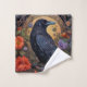 Toalha com corvo preto. Um arco amarelo atrás. Cercado por flores vermelhas e roxas. Legal vibração gótica.