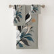 Um impressionante pavão preto rodeado por flores macias brancas e bege, acentuado com folhas pretas ousadas que ecoam sua presença dramática.