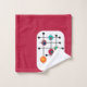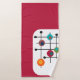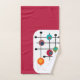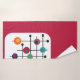 Este conjunto de toalhas tem um design moderno do século médio de um retângulo magenta com um retângulo branco na parte inferior com uma grelha preta com círculos retrorreflectores.