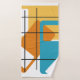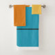 Este conjunto de toalhas tem um pano de lavagem dourado, uma toalha de mão laranja, e uma toalha de banho com um design moderno do século médio de três retângulos, laranja, verde e turquesa, com um dentro de retângulo branco cada. Se você gosta do design, mas prefere cores diferentes, me mande mensagem.