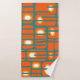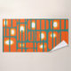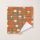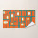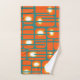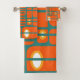 Este conjunto de toalhas tem uma design de retângulos laranja modernos do século médio, com círculos brancos e dourados, e linhas horizontais que os atravessam num campo de chalé.