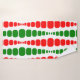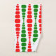 Este conjunto de toalhas tem um design moderno do século médio de retângulos rochosos vermelhos e verdes em tamanho crescente e decrescente correndo verticalmente num campo de branco.