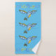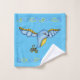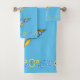 Este conjunto de toalhas de banho que inclui uma toalha de lavagem, uma toalha de mão e uma toalha de banho são azuis com pássaros azuis voadores que têm sotaques amarelos e caudas rolantes. A borda rolada do rico está no topo e na parte inferior. Compre o conjunto inteiro ou individualmente.