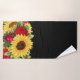 Uma bela toalha de banho, decorada com rosas vermelhas belas e elegantes e girassóis amarelos sobre fundo preto. Inclui a toalha, a toalha da mão e o pano de lavagem.