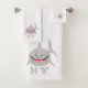 Bath towel set, consisting of a face cloth, hand towel and bath towel with a shark design. You can customise this bath towel set with any text of your choice. Should you require any help with customising then contact us through the message link on this page. Shark design bathroom towel set