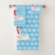 Este belo banho Toalha apresenta um boneco de neve, com um chapéu de cima contra fundo de floco de neve. Você pode personalizar o texto no banner branco e o fundo azul também pode ser alterado.