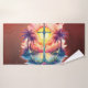 Solar anchor in a tropical paradise. Vibrant design with prominent anchor and cross, surrounded by palm trees, radiant sun and island scenery; neon palette and intense sunset for a bold and tropical look.