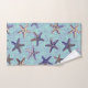 Starfish na areia com Coralize Bath Toel Set. Estrelas coloridas em roxo, rosa, cinzas e marrom em um fundo azul-lacrimejante e texturizado roxo. Acento o conjunto é Coralize, coral em tons de roxo. Oceano, orla marítima, casa de praia náutica inspirou decoração de banheiro.