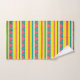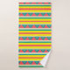 Toalhas definidas com faixas cor-de-rosa, amarela, branca e azul e triângulos azuis e amarelos.
