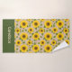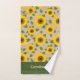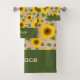 Country at its best on this towel set! Bright yellow sunflowers with green leaves are superimposed on a tan burlap texture, very cute and fun! Personalize with your name in a wide, green band at the bottom.