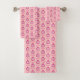 Este fantástico conjunto de toalhas inclui um pano de lavagem, toalha de mão e toalha de banho. Você pode optar por comprar o conjunto inteiro ou selecionar qual das toalhas deseja comprar. A design apresenta uma tartaruga rosa fofinha com grandes olhos pretos e uma bonito casca rosa de dois tons. Ela tem pequenos pés cor-de-rosa e uma cauda fofa. Há texto debaixo da tartaruga que diz tartaruga. Isso seria um presente divertido para uma mulher de qualquer idade.