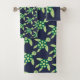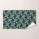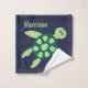 Tartarugas brilhantes e verdes ilustradas em toalhas azuis escuras, incluindo tecido facial personalizado para crianças.
