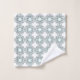 A patterned towel and matching washcloth are displayed. The design features teal and white geometric motifs, conveying a clean and modern aesthetic.