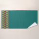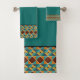 A geometric pattern of diamonds and stripes in teal, orange, rust-red, and black creates and eye-catching border on this bath towel set. Modern, stylish, and elegant, and perfect for any decor.