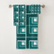 Este conjunto de toalhas tem um design geométrico feito de Ls em tons de chel dispostos em diferentes direções se repetindo na design.