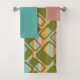 Este conjunto de toalhas tem um pano de lavagem colorido de tijolos, uma toalha de mão turquesa, e uma toalha de banho com um design moderno do século médio de retângulos verdes arredondados com buracos sobre um fundo de listras em cores modernas do século médio. Se você gosta do design, mas prefere cores diferentes, me mande mensagem.