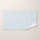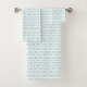 Towels with a light blue fish pattern hang neatly on a silver rod against a white wall. Below, a matching hand towel is displayed flat, exuding a fresh, nautical vibe.