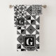 Na moda e conjunto de toalhas de banho único apresentam um triângulo preto e branco moderno e um padrão geométrico uniforme quadrado com design de letra inicial monograma da família personalizada.