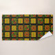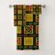 Este conjunto de toalhas tem um design de História Negra de círculos, triângulos, diamantes, linhas e zigures formando um padrão.
