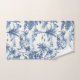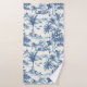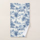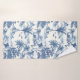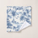 A imagem retrata um padrão clássico de mosaico de Jouy, caracterizado por cenas detalhadas em azul sobre fundo branco. Apresenta paisagens tropicais com palmeiras exuberantes, terreno rochoso e massas de água serenas. Há elementos como cabanas pequenas, pássaros em voo, e ilhas distantes, dando ao design uma sensação idílica e pacífica. O padrão é intrincado e evoca uma sensação de elegância pastoral tradicional muitas vezes associada às artes decorativas francesas.