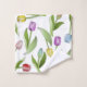 O design do produto apresenta um padrão de flores tulipas coloridas em roxo, vermelho, rosa, azul e amarelo. Esta ilustração botânica torna elegantes toalhas de banho modernas e únicas.