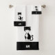 Tuxedo cat e monograma no conjunto de toalhas de banho preto e branco. Imagem de gato apenas em um canto. Design para solteiros e casais elegantes!