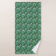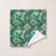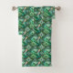 "Two images showcasing towels with an intricate green hummingbird and floral pattern. The top image displays two towels on a rack. The bottom image shows a washcloth with a corner folded over, revealing a white underside."