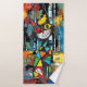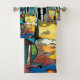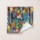 Um gato branco com aparência geométrica, de vidro manchado se encontra em uma floresta vibrante de pássaros. O fundo apresenta uma mistura colorida de folhas de outono e tons de azul e amarelo. Photoshop de arte digital