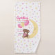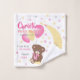 Bela e colorida estátua de nascimento de uma menina com um adorável desenho animado de ursinho de pelúcia com uma fita arco rosa sobre uma lua dormindo segurando balões em estrelas amarelas claras e rosa e coloridas. Adorável parentesco de menina é arte. Fácil de personalizar substituindo o nome e os detalhes.