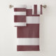 Moderno conjunto de toalhas de banho listradas. Cores brancas, cinzentas e brilhantes, vermelhas sombreadas. Elegante decoração moderna.
