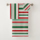 Adicione um acento festivo a seu banheiro esta época natalícia com um grupo feito sob encomenda à moda de toalha que inclui um pano da lavagem, uma toalha de mão, e uma toalha de banho que caracteriza um teste padrão moderno do Natal do vermelho, do verde da hortelã, de verdes escuro, e as listras brancas em larguras de variação. Compre o conjunto completo ou qualquer parte dela.