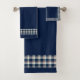 Essas toalhas são projetadas em um azul escuro com uma borda xadrez de um azul e branco cremoso correspondentes. Eles são projetados para coordenar com outros produtos de banheiro com o mesmo título (cortinas de chá, tapetes de banho e acessórios de banho).