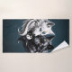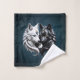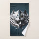 Yin Yang Wolves. A imagem mostra um lobo branco e um lobo negro, suas cabeças encarando-se umas às outras em um tiro de perto. O lobo branco tem olhos azuis e um ornamento ouro com uma joia azul na testa, enquanto o lobo negro tem olhos amarelos e ornamento semelhante. Os lobos estão posicionados contra um fundo azul escuro com um símbolo yin yang branco entre eles.