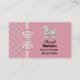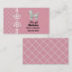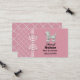 Cartão de networking de mamãe fofo feito em um fundo rosa, no lado direito, e um desenho de renda rosa e branco, no lado esquerdo e no verso. Gráficos de uma fita xadrez rosa e branca correndo verticalmente entre os dois fundos são decorados com um laço xadrez. Um poodle branco fofinho e fofinho decora a parte superior direita do cartão, com texto preto personalizado abaixo dele. Personalize este cartão divertido como uma ótima maneira de manter contato com outras mães para organizar festas, encontros e babás.
