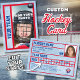 Seja como os profissionais, tendo seu próprio cartão de hóquei personalizado com uma foto sua na frente e suas estatísticas pessoais de hóquei nas costas. Você terá muitas cartas em um pacote porque essas cartas são feitas para trocar com amigos e também para dar aos parentes. Coloque seu jogador de liga em um cartão hoje! Tanto a frente como o verso do cartão de hóquei têm uma superfície de gelo marcada com skate como fundo com bordas vermelhas.