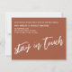 Nesta peça, a fonte de script escrita à mão foi usada para criar gráficos que retratavam as palavras "novo endereço. ainda vivendo fora das caixas. não julgue." na frente, e "mantenha-se em contato" no verso. O plano de fundo pode ser alterado para qualquer cor que você preferir. Por favor, responda a quaisquer solicitações especiais ou personalize a assistência. 100 //
