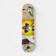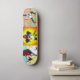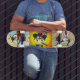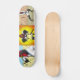 A galinha do samurai está para trás, praticando seus movimentos das artes marciais com katana, em um skate.