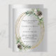 Para um casamento no inverno. Um fundo com aspecto fino de prata decorado com cones, bagas brancas e verde. Uma falsa armação de ouro. Personalize e adicione seus nomes e detalhes. 1 folha = 1 convite impresso de borda a borda.