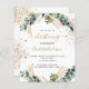 Um fundo branco decorado com verde de eucalipto e folhas de ouro e gotas falsas de ouro. Personalize e o nome e os detalhes da cerimônia. Letras pretas e ouros coloridas. Traseira: fundo branco com quedas de brilho de falso ouro