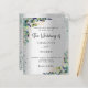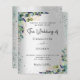 Fundo de aspecto fino prateado decorado com verde de eucalipto, folhagem de ouro e brilho verde e prata, faíscas. Personalize e adicione seus nomes e detalhes do casamento. Letras negras.