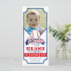 Prepare-se para ir a casa com este adorável Convite para primeiros aniversarios "Rookie of the Year"! Projetado como um clássico ingresso de beisebol, este convite é perfeito para comemorar o grande dia do seu pequeno enrolador. Com um vibrante esquema de cores vermelho e azul, este convite captura o espírito do passatempo favorito da América. Ele apresenta uma modelo especial para uma foto, permitindo que você mostre seu rosto charmoso de bebê como o novato da estrela. O design combina perfeitamente elementos de um jogo de beisebol com a alegria de uma primeira festa de aniversário. Este convite personalizável é ideal para qualquer aniversário temático de beisebol, uma festa tematizada de esporte ou uma celebração de primeiro aniversario de um garoto dedicado. Convide amigos e família para se juntarem à equipe e celebrar seu novato do ano atingindo seu primeiro marco de aniversário. Personalize facilmente todos os detalhes de um convite de aniversário de beisebol único e memorável que terá todo mundo aplausos!