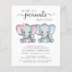 Um belo e amigável convite para o gêmeo e a menina, que são amigáveis ao orçamento, com "Dois Docinhos Doce Estão A Caminho" escrito em tipografia de cinza macia e um roteiro de na moda com pântanos, e duas aquarelas cor-de-rosa e azul pastel de elefantes bebês. Adicione o nome da futura mãe e os detalhes do chá em uma simples tipografia de cinza.