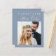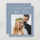Casamento privado, empoeirado, azul, empoeirado, anúncio de elopemento e convite de recepção que mostra sua foto, "Felizmente Nunca Depois da Festa" em uma mistura de simples tipografia branca e um guião branco moderno e chique e seus primeiros nomes e data do casamento. Ao contrário, personalize seu anúncio e convite e adicione seus nomes em um script semelhante a assinatura.