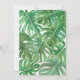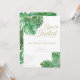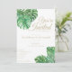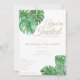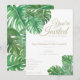 Convite de casamento simples e limpo com folhas de queijo tropical em aquarela. O texto está numa variedade de fontes clássicas em letras douradas.
