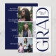 Anúncio de formatura moderno e elegante com um layout limpo e minimalista e um fundo neutro suave. O design destaca três painéis de fotos que mostram o graduado em momentos espontâneos e em estilo retrato, criando um toque pessoal. Um elemento tipográfico vertical e ousado “GRAD” adiciona um toque contemporâneo, enquanto dentro da letra dia exibe “Turma de 2026” para um acabamento polido. O nome do graduado e da escola são apresentados em um formato vertical elegante, tornando este convite perfeito para mostrar conquistas com estilo e sofisticação. O verso inclui os detalhes da celebração e as informações de resposta ao convite.