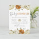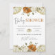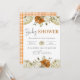 Dê as boas-vindas a um novo bebê com este encantador convite de chá de bebê inspirado no outono! Com elegantes abóboras brancas, flores em tons de ferrugem e folhagens delicadas dispostas em torno de uma aconchegante borda xadrez laranja, este design captura perfeitamente a calidez de uma celebração com tema outonal.