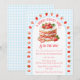 At the center of this baby shower invitation is the sweetest strawberry shortcake, framed by a scalloped border sprinkled with tiny strawberries like little kisses of summer. Set against a soft watercolor gingham backdrop, the whole design feels light, nostalgic, and delightfully fresh.