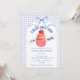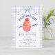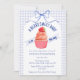 At the center of this baby shower invitation sits an adorable cupcake crowned with a sweet strawberry. A soft watercolor gingham backdrop and a delicately tied bow complete the look, creating a celebration that feels warm, whimsical, and beautifully inviting.